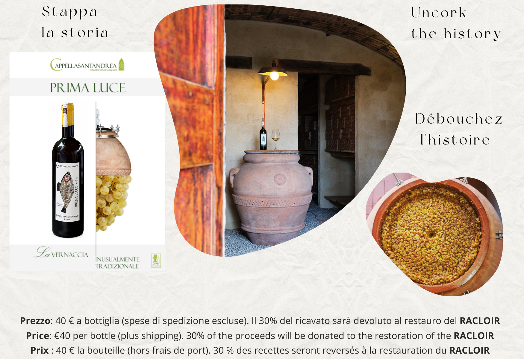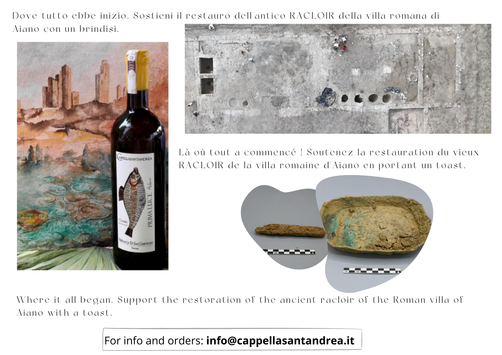 Souhaitez-vous contribuer à la restauration d’un racloir de bronze romain découvert dans un bassin de décantation du vin de la villa d’Aiano ? Si oui, vous pouvez acheter une ou plusieurs bouteilles de Vernaccia « Prima Luce » de la cave Cappella Sant’Andrea de San Gimignano !